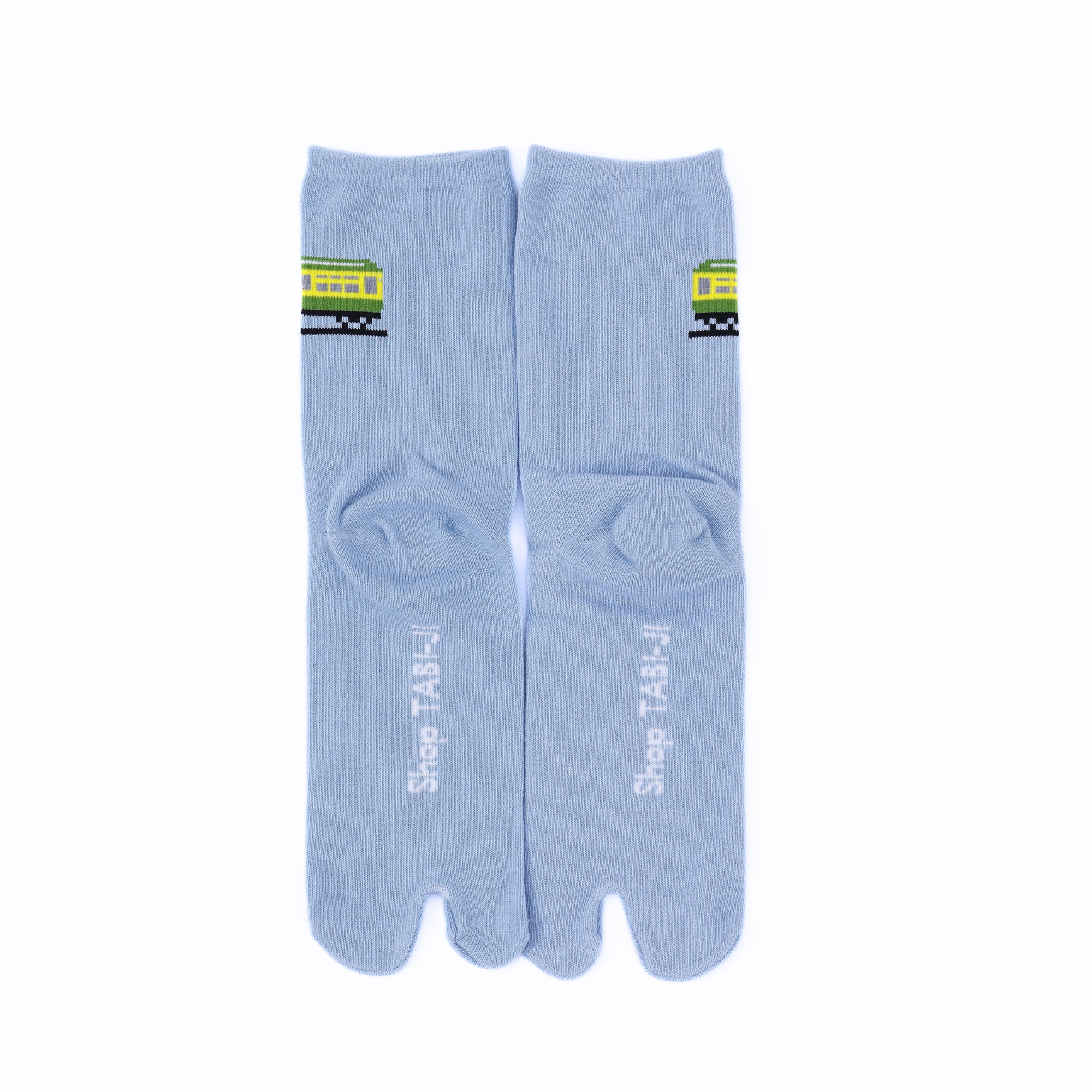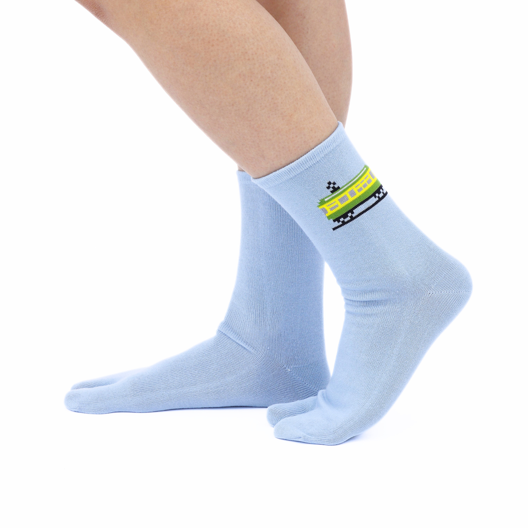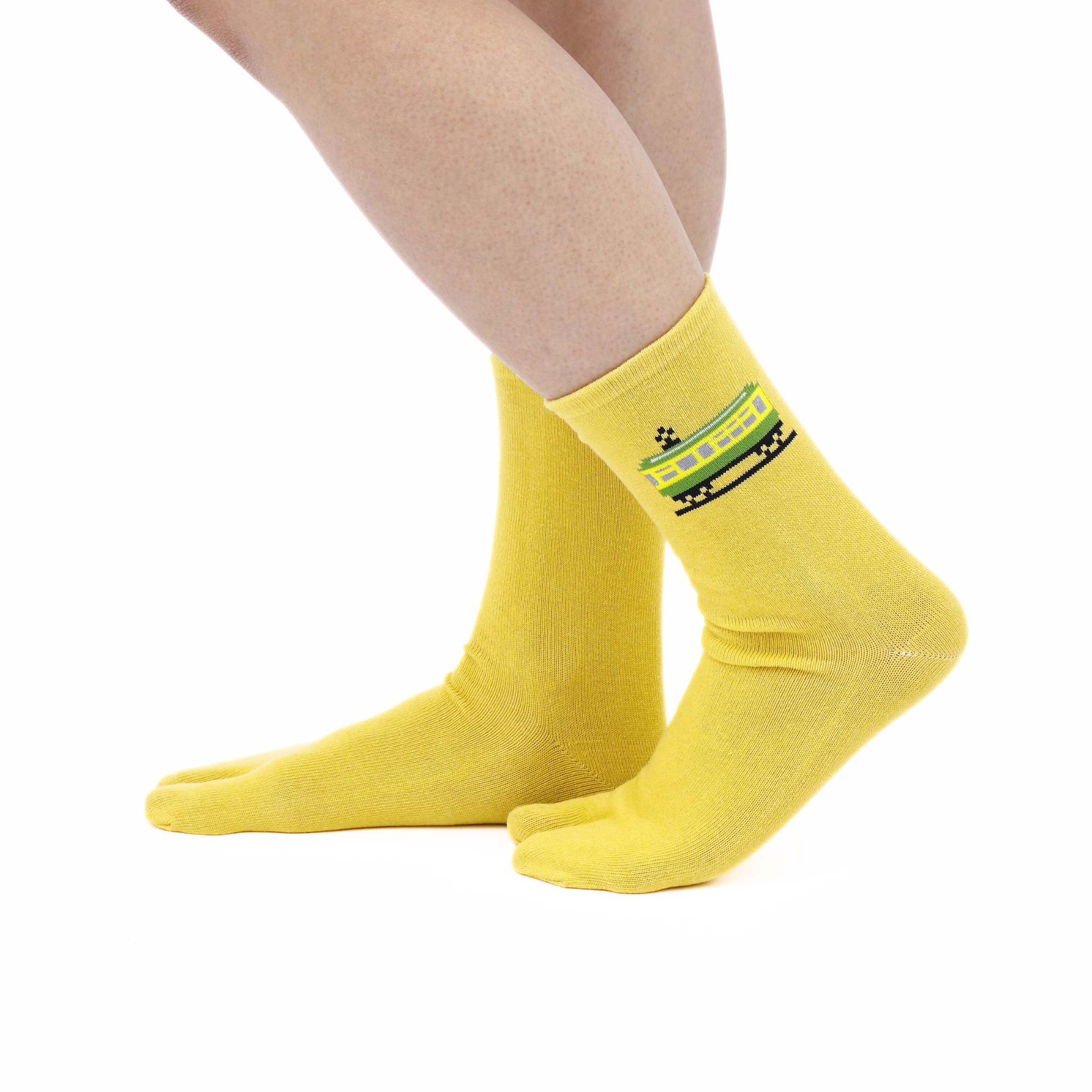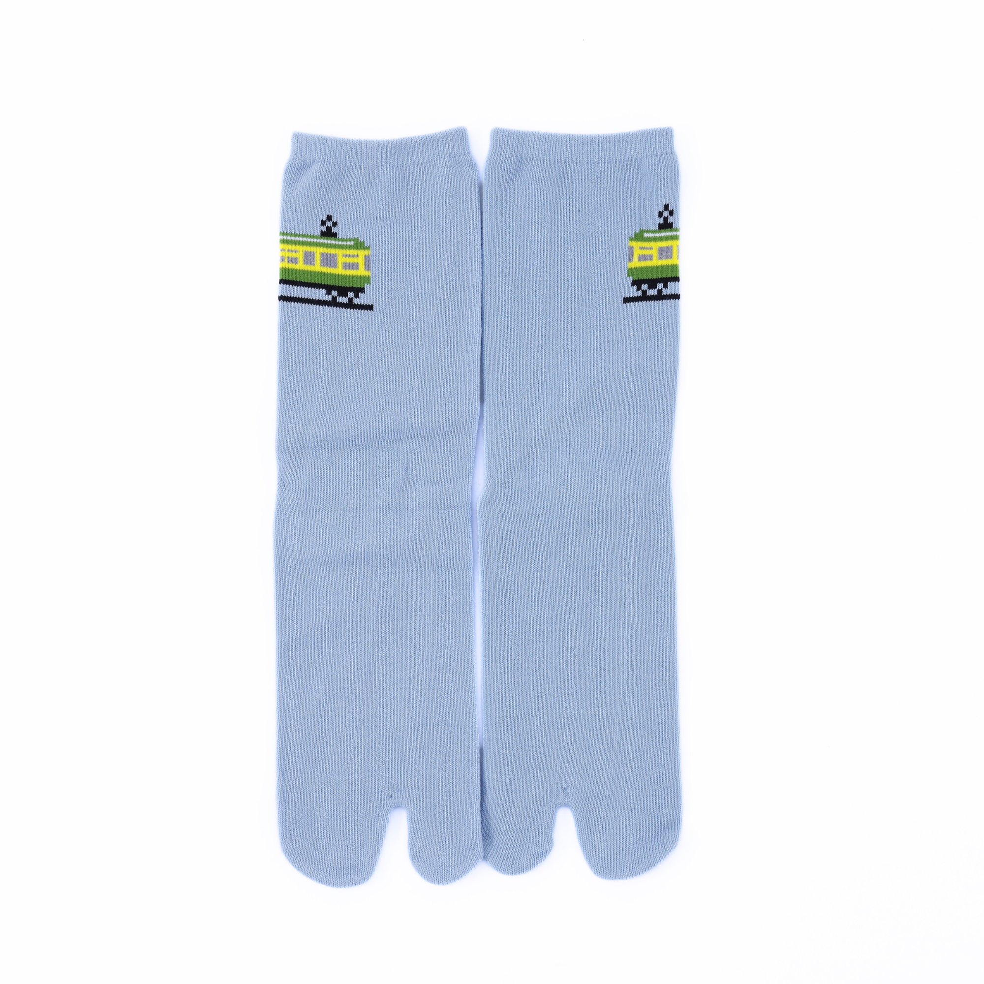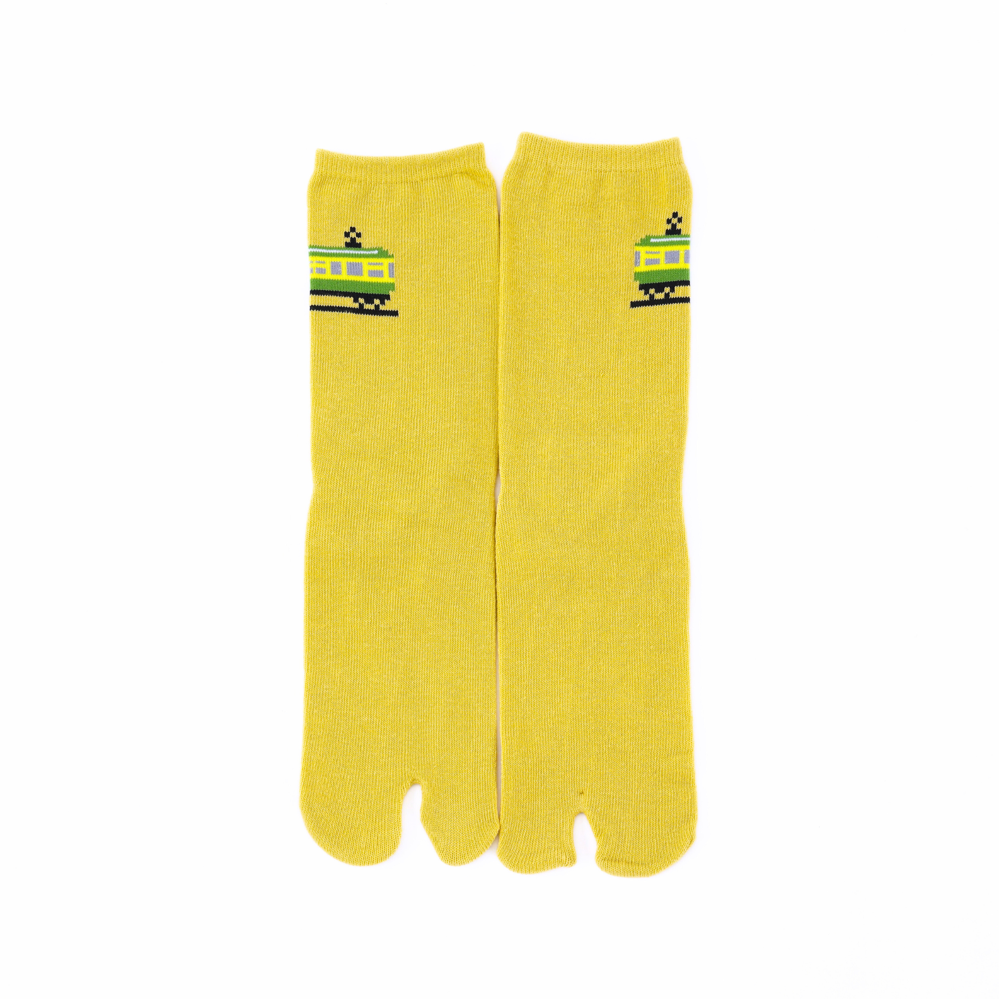 レトロゲームの世界を彷彿とさせる、ドット絵スタイルが特徴のオリジナル足袋ソックスシリーズ。懐かしさを感じる緑と黄色の配色で、電車が走る様子をピクセルアートで表現したユニークな一足。動きのあるデザインは、見ているだけで楽しく、履く人も見る人も笑顔にしてくれます。キッズとジュニアサイズもあり、親子コーデにも最適です。