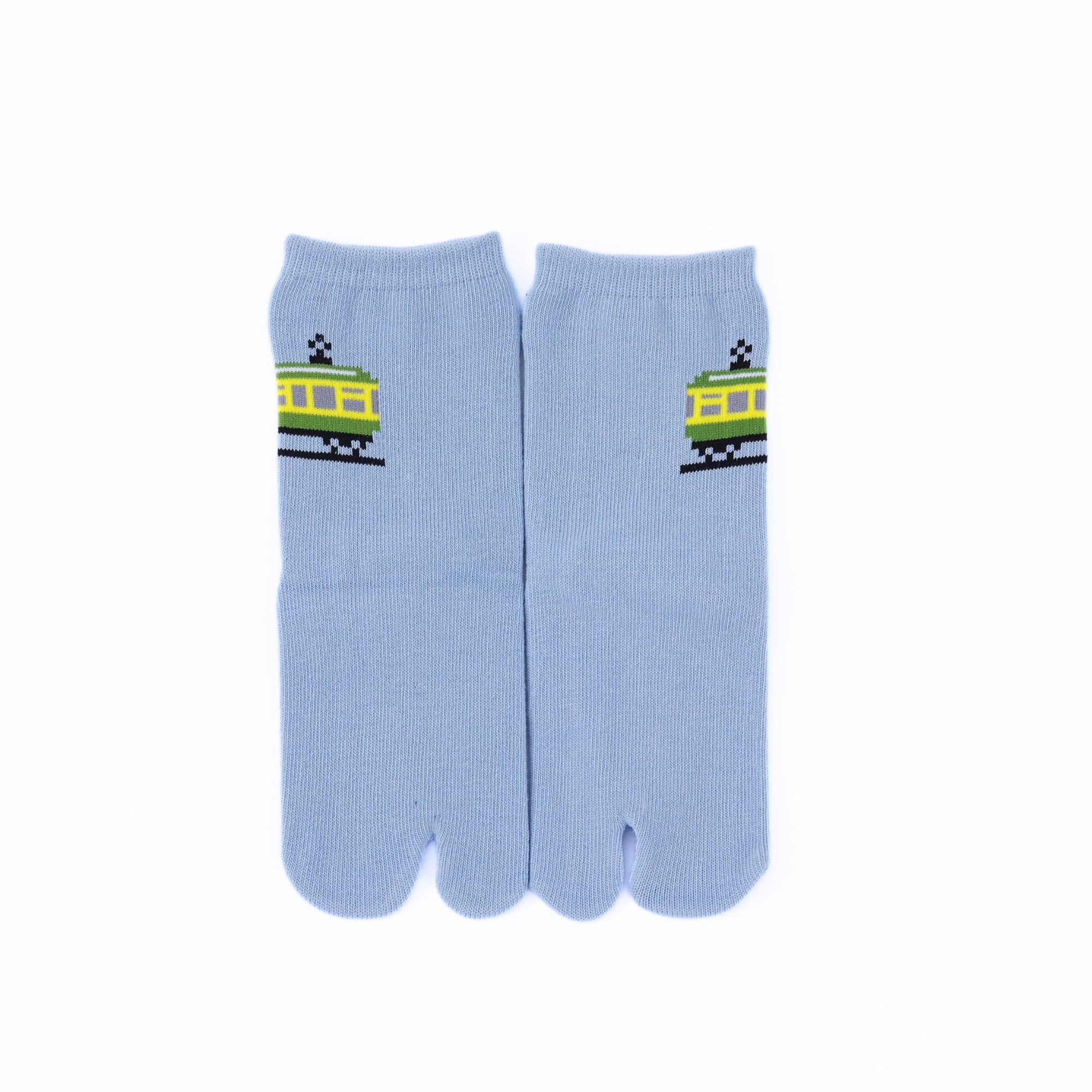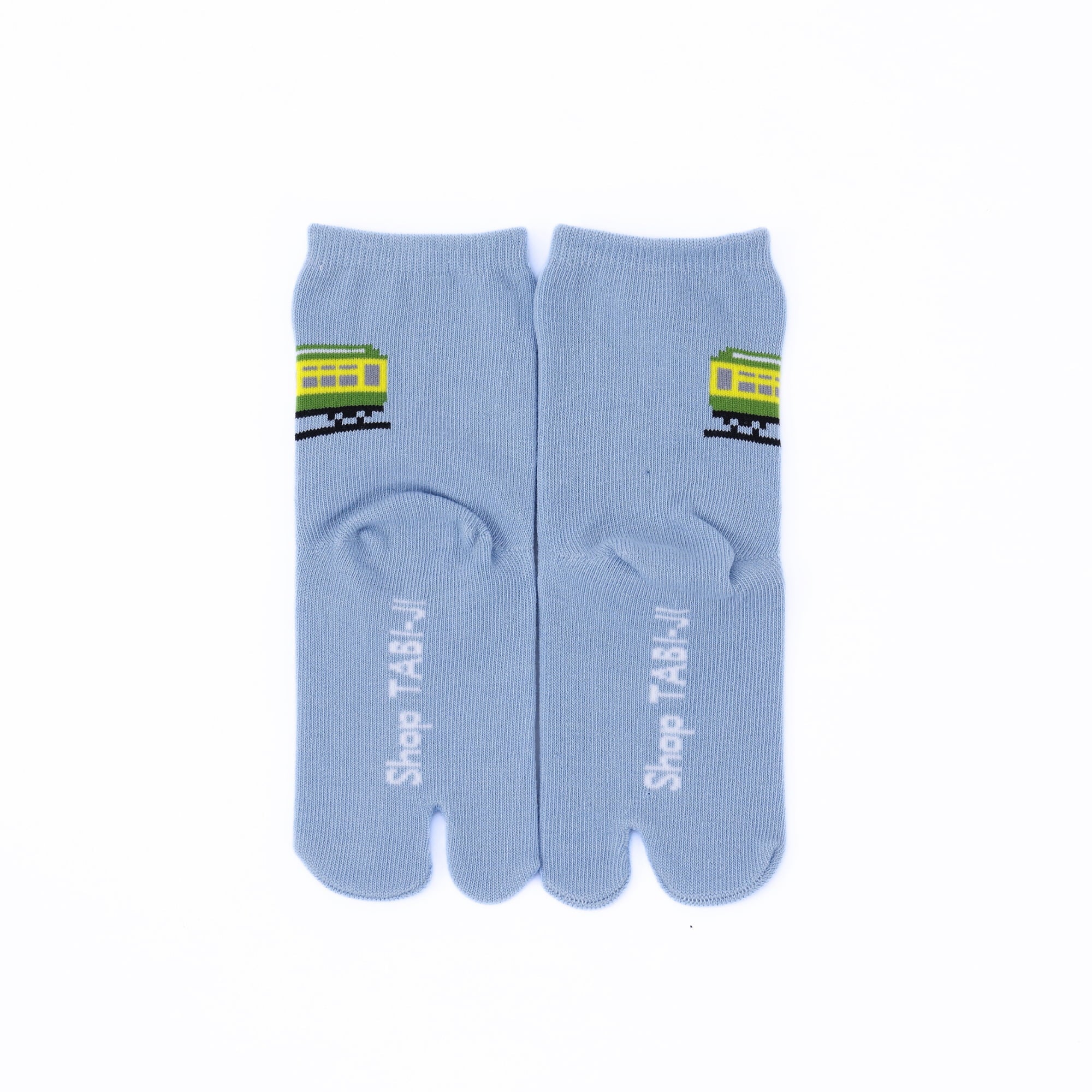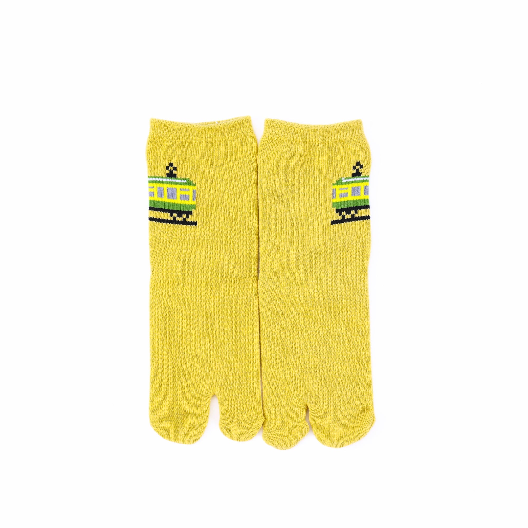 A unique pair of original Tabi socks featuring a pixel art style that evokes the charm of retro video games. This playful pair showcases a train in motion, illustrated in charming green and yellow pixelated graphics that evoke a nostalgic feel. The dynamic design brings joy to both the wearer and those who see it. Sizes for children (13-18cm / 19-23 cm) are also available.